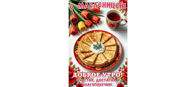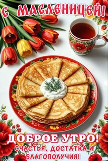 Открытка "С МАСЛЕНИЦЕЙ! ДОБРОЕ УТРО! СЧАСТЬЯ, ДОСТАТКА И БЛАГОПОЛУЧИЯ!"