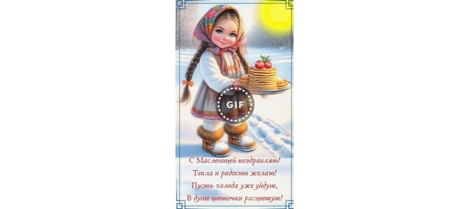 Анимированная открытка "С Масленицей поздравляю! Тепла и радости желаю! Пусть холода уже уйдут, в душе цветочки расцветут!"