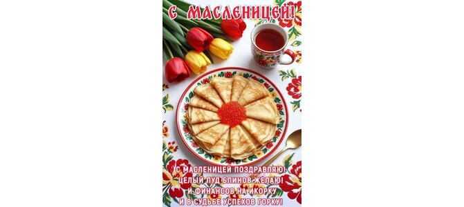 Открытка "С МАСЛЕНИЦЕЙ! С МАСЛЕНИЦЕЙ ПОЗДРАВЛЯЮ! ЦЕЛЫЙ ПУД БЛИНОВ ЖЕЛАЮ! И ФИНАНСОВ НА ИКОРКУ И В СУДЬБЕ УСПЕХ"