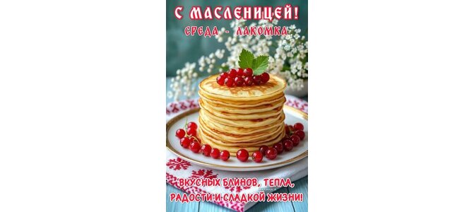 Открытка "С МАСЛЕНИЦЕЙ! СРЕДА - ЛАКОМКА. ВКУСНЫХ БЛИНОВ, ТЕПЛА, РАДОСТИ И СЛАДКОЙ ЖИЗНИ!"