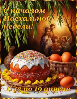 Красочная поздравительная открытка к началу Пасхальной недели. На изображении представлена священная семья в ореоле света, а на переднем плане — праздничный пасхальный кулич, украшенный белой глазурью и цветной посыпкой, рядом с которым лежат крашеные яйца в корзине. В верхней части надпись золотыми буквами «С началом Пасхальной недели!», в нижней — «С 13 по 19 апреля». Теплая, духовная и праздничная атмосфера.