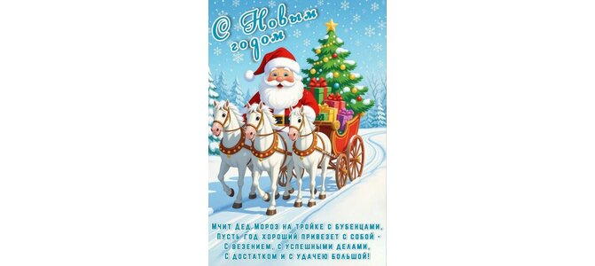Открытка "С Новым годом! Мчит Дед Мороз на тройке с бубенцами, пусть год хороший привезет с собой."