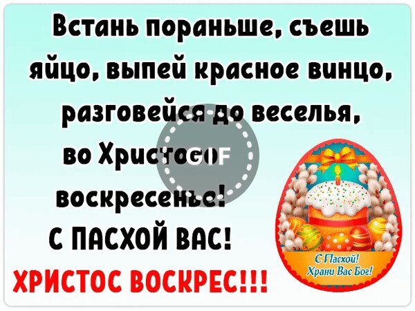С Пасхой! Храни вас Бог! Встань пораньше, съешь яйцо, выпей красное винцо, разговейся до веселья, во Христово Воскресенье! С Пасхой вас! Христос воскрес!