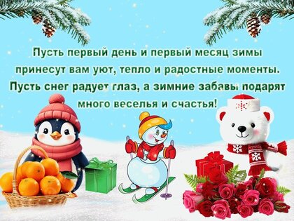 Добрые пожелания." Пусть первый день и первый месяц зимы принесут вам уют, тепло и радостные моменты. Пусть снег радует глаз, а зимние забавы подарят много веселья и счастья!"
