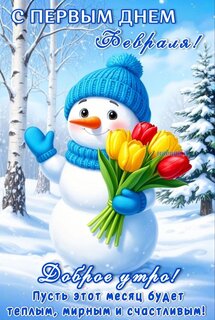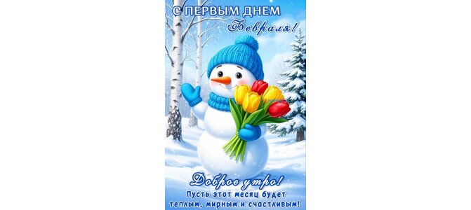 Открытка "С ПЕРВЫМ ДНЕМ ФЕВРАЛЯ! ДОБРОЕ УТРО! ПУСТЬ ЭТОТ МЕСЯЦ БУДЕТ ТЕПЛЫМ, МИРНЫМ И СЧАСТЛИВЫМ!"