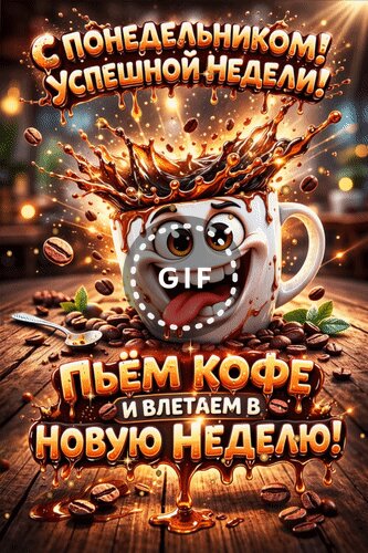 Анимированная открытка "С понедельником! Успешной недели! Пьём кофе и влетаем в новую неделю!"