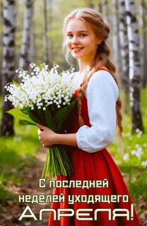 Прекрасная молодая девушка в светлом платье и красном сарафане стоит в солнечном березовом лесу, держа в руках пышный букет нежных ландышей. На изображении присутствует поздравительная надпись на русском языке: "С последней неделей уходящего апреля!". Атмосферное и светлое фото, передающее весеннее настроение, свежесть природы и красоту первоцветов. Подходит для поздравительных открыток и тематических постов в социальных сетях.