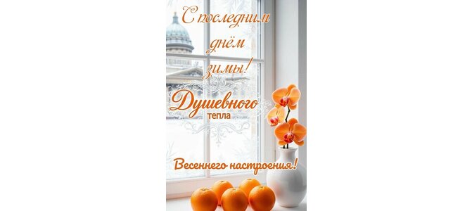 Открытка "С последним днём зимы. Душевного тепла. Весеннего настроения"