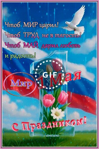 Анимированная открытка "С Праздником! 1 Мая Чтоб Мир царил! Чтоб Труд не в тягость! Чтоб Май дарил любовь и радость!"