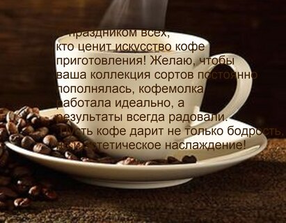 Теги:с праздником всех, кто ценит искусство кофеприготовления желаю, чтобы ваша коллекция сортов постоянно пополнялась, кофемолка работала идеально, результаты, всегда, радовали, пусть, кофе, дарит, только, бодрость, но и эстетическое наслаждение