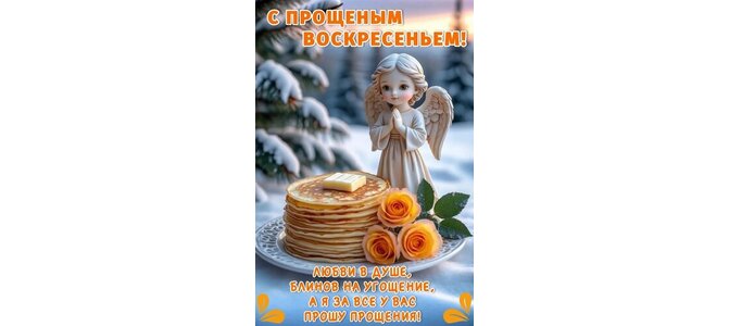 Открытка "С ПРОЩЕНЫМ ВОСКРЕСЕНЬЕМ! ЛЮБВИ В ДУШЕ, БЛИНОВ НА УГОЩЕНИЕ, А Я ЗА ВСЕ У ВАС ПРОШУ ПРОЩЕНИЯ!"
