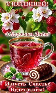 Красивая поздравительная открытка к пятнице с изображением чашки ароматного малинового чая, аппетитного шоколадного рулета и спелой малины. На фоне — нежные цветущие ветви и ягоды. Изображение наполнено уютом и летним настроением, идеально подходит для отправки друзьям и близким в мессенджерах (WhatsApp, Viber) для пожелания хорошего дня и счастья. С праздничными надписями на русском языке: «С ПЯТНИЦЕЙ! С Хорошим Днём! И пусть Счастье Будет в нём!»