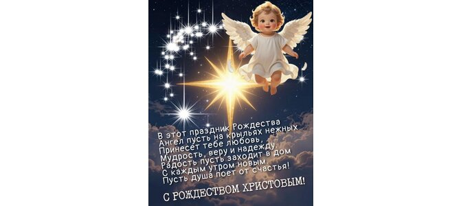 В этот праздник Рождества Ангел пусть на крыльях нежных принесет тебе любовь, мудрость, веру и надежду. Радость пусть заходит в дом с каждым утром новым. Пусть душа поет от счастья! С Рождеством Христовым!