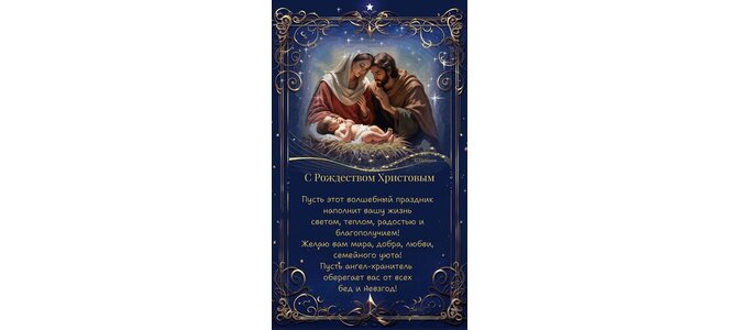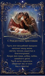 С Рождеством Христовым. Пусть этот волшебный праздник наполнит вашу жизнь светом, теплом, радостью и благополучием! Желаю вам мира, добра, любви, семейного уюта! Пусть ангел-хранитель оберегает вас от всех бед и невзгод!