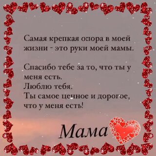 Самая крепкая опора в моей жизни - это руки моей мамы. Спасибо тебе за то, что ты у меня есть. Люблю тебя. Ты самое ценное и дорогое, что у меня есть! Мама.