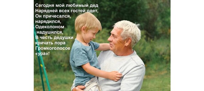 Теги:сегодня мой любимый дед нарядней всех гостей одет, он причесался, нарядился, одеколоном надушился, в честь дедушки кричать пора громкоголосое ура