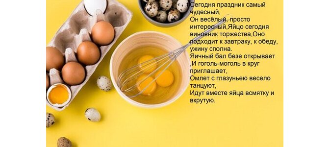 Теги:сегодня праздник самый чудесный, он весёлый, просто интересный, яйцо сегодня виновник торжества, оно подходит к завтраку, к обеду, ужину сполна яичный бал безе открывает, и гоголь-моголь в круг приглашает, омлет с глазуньею весело танцуют, идут вместе яйца всмятку и вкрутую