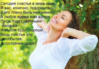 Открытка "Сегодня счастья в мире день, Я вас, конечно, поздравляю, В его плену быть неизменно В любое время ва"