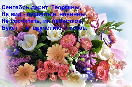Теги:сентябрь дарит георгины, на вид - пушистые, невинны не сосчитать, их лепестков, букет - к вручению - готов
