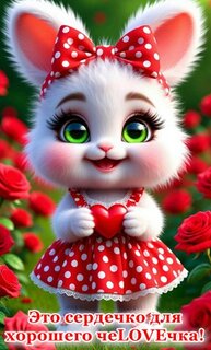Милая и очаровательная белая зайка в красном платье в белый горошек с пышным бантом на голове. Малышка держит в лапках ярко-красное сердце на фоне прекрасного сада с красными розами. Эта трогательная и нежная цифровая иллюстрация идеально подходит для выражения любви, симпатии и теплых чувств. Высокая детализация шерстки, выразительные зеленые глаза и праздничная атмосфера делают картинку идеальной для открытки или поздравления.