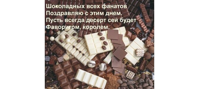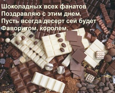 Шоколадных всех фанатов Поздравляю с этим днем. Пусть всегда десерт сей будет Фаворитом, королем.