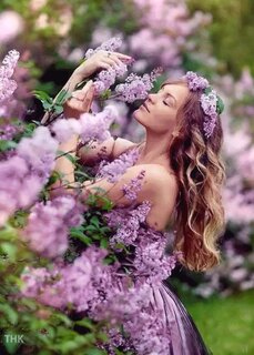 Эстетичное художественное фото молодой девушки с длинными светлыми волосами, окруженной пышными цветами сирени. Девушка в нежно-фиолетовом платье с закрытыми глазами наслаждается ароматом весны, прижимаясь к цветущим кустам. Снимок выполнен в мягком, романтичном стиле с использованием эффекта боке, что создает атмосферу сказки, нежности и весеннего пробуждения природы. Идеально подходит для тем весенней моды, эстетики природы и мечтательных портретов.