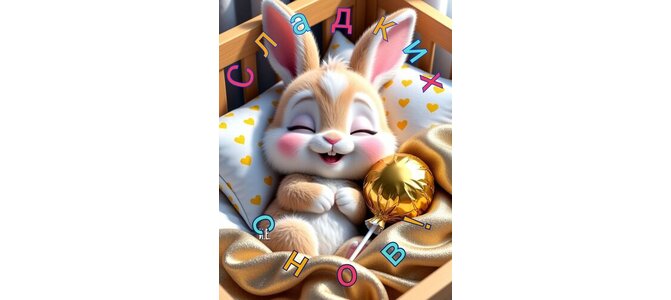 Вт кроватке сладко спит зайчик. Надпись на открытке "Сладких снов!"