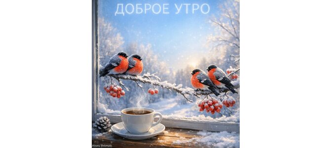Открытка "Снегири поют, кофе дымится — доброе утро!"