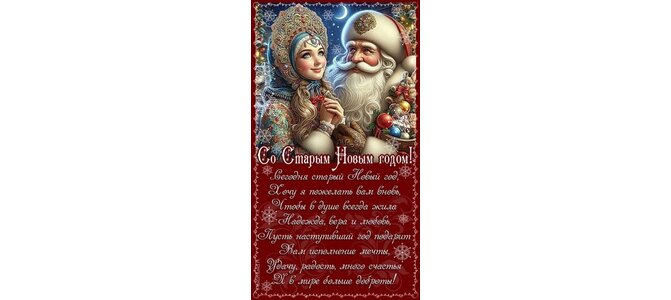 Со Старым Новым годом! Сегодня старый Новый год, хочу я пожелать вам вновь, чтобы в душе всегда жила надежда, вера и любовь. Пусть наступивший год подарит Вам исполнение мечты, удачу, радость, много счастья и в мире больше доброты!