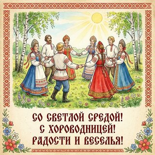 Иллюстрация в стиле русской народной сказки, изображающая группу людей в традиционных славянских костюмах, танцующих веселый хоровод на фоне солнечного летнего луга и березовой рощи. На картинке изображены мужчины и женщины в вышитых рубахах, сарафанах и кокошниках, взявшиеся за руки под ярким солнцем. В нижней части изображения расположена праздничная надпись на русском языке: "Со светлой средой! С хороводницей! Радости и веселья!". Изображение обрамлено декоративным орнаментом в этническом стиле с цветочными элементами по углам. Идеально подходит для тематики славянских праздников, фольклора и народных гуляний.