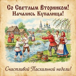 Иллюстрация в ретро-стиле, посвященная славянским традициям. На картинке изображена группа молодых людей в традиционных русских народных костюмах, которые празднуют начало Купалищ (праздников купания) у реки. На заднем плане видны деревянные избы и православный храм с золотыми куполами. Текст на картинке гласит: "Со Светлым Вторником! Начались Купалища!" и "Счастливой Пасхальной недели!". Изображение передает атмосферу радостного народного гуляния, весеннего пробуждения природы и духовных традиций. Идеально подходит для тематических подборок о славянском фольклоре, православных праздниках и народных обычаях.