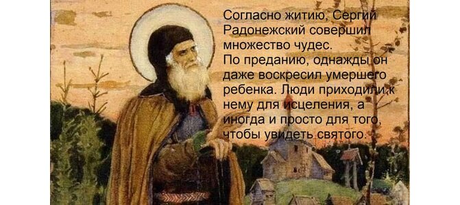 Теги:согласно житию, сергий радонежский совершил множество чудес по преданию, однажды он даже воскресил умершего ребенка люди приходили к нему для исцеления, а иногда и просто для того, чтобы увидеть святого
