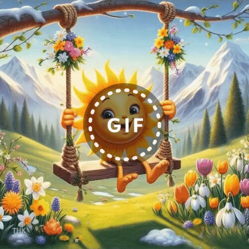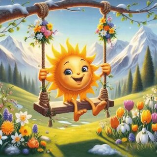 Яркая и сказочная иллюстрация с антропоморфным улыбающимся солнышком, которое весело качается на качелях, подвешенных к ветке дерева. На заднем плане величественные заснеженные горы под голубым небом, зеленые хвойные леса и цветущий весенний луг с разнообразными цветами. Картина наполнена солнечным светом, радостью и ощущением весеннего обновления, выполнена в стиле цифровой живописи с насыщенными цветами.