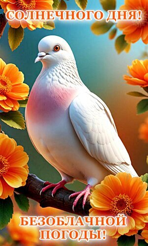 Красочное поздравительное изображение с изображением белого голубя, сидящего на ветке среди ярких оранжевых цветов. На картинке расположены вдохновляющие надписи на русском языке: «СОЛНЕЧНОГО ДНЯ!» в верхней части и «БЕЗОБЛАЧНОЙ ПОГОДЫ!» в нижней. Нежный фон и солнечный свет создают атмосферу уюта, мира и радости. Идеально подходит для открытки, пожелания хорошего настроения или позитивного настроя на день.