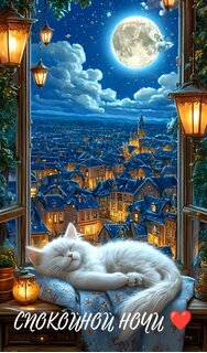 Теги:спокойной ночи, спящий белый кот, окно, город в полумраке