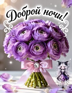 Красивая поздравительная открытка с пышным букетом фиолетовых ранункулюсов. На изображении представлен аккуратный букет нежных цветов, перевязанный атласной розовой лентой с блестящей брошью. В верхней части картинки каллиграфическим шрифтом написано «Доброй ночи!». В правом нижнем углу расположена милая иллюстрация сказочной девочки в фиолетовом платье. Фон мягкий, размытый, с эффектом мерцающих огоньков и лепестков, создающий романтичную и уютную атмосферу. Идеально подходит для отправки в мессенджерах и соцсетях в качестве пожелания спокойной ночи.