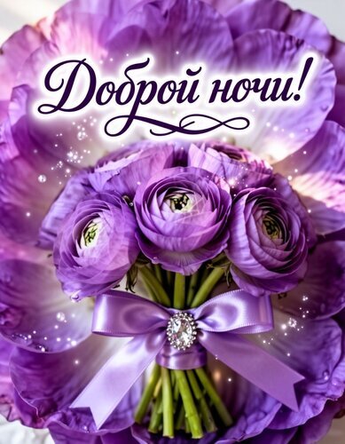 Красивая открытка с надписью «Доброй ночи!» на фоне пышного букета фиолетовых цветов. На изображении представлены нежные пурпурные ранункулюсы, собранные в элегантный букет и перевязанные атласной лентой с декоративной брошью. Фон дополнен мягким свечением и мерцающими искрами, создающими атмосферу уюта, спокойствия и волшебства. Идеально подходит для отправки в мессенджерах и социальных сетях в качестве пожелания приятных снов близким, друзьям или любимым.