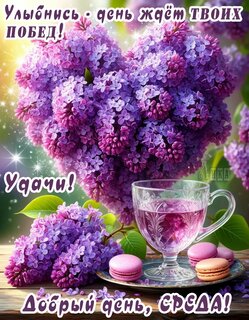Теги:среда, дни недели, добрый день, весна, сирень, цветы, печенье, вкусняшка, чай, красивая картинка, улыбнись, удачи, день ждет твоих побед