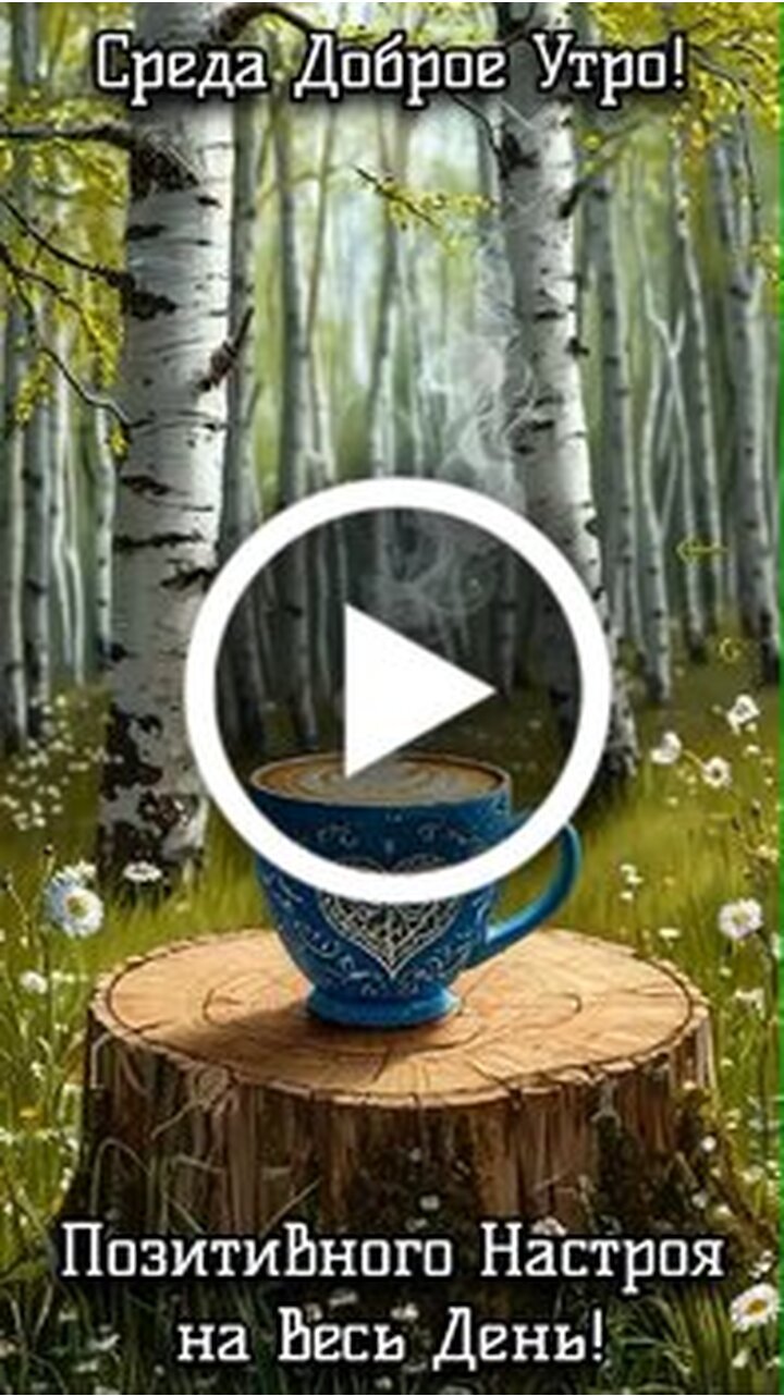 Красивое и доброе видео для пожелания хорошего утра в среду. Сюжет представляет собой уютную лесную сцену среди берез, где на пне стоит чашка дымящегося кофе с узором в виде сердца. В кадре появляется милый кролик, который лакомится напитком и наслаждается моментом спокойствия. Видео наполнено атмосферой тепла и умиротворения, идеально подходящей для того чтобы подарить позитивный настрой на весь день своим близким и друзьям.