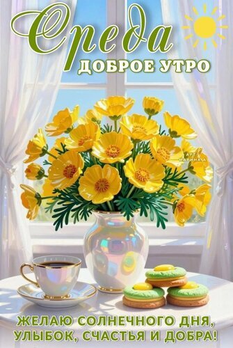 Открытка "СРЕДА. ДОБРОЕ УТРО! ЖЕЛАЮ СОЛНЕЧНОГО ДНЯ, УЛЫБОК, СЧАСТЬЯ И ДОБРА!"