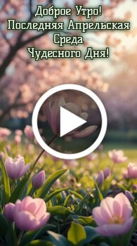 Красивое и вдохновляющее видео для доброго утра. На фоне цветущего весеннего сада с нежными розовыми тюльпанами и цветущими деревьями наложена поздравительная надпись Доброе утро Последняя Апрельская Среда Чудесного Дня. Видео наполнено атмосферой весеннего обновления и радости природы. Оно идеально подходит для того чтобы отправить близким пожелание прекрасного настроения и чудесного дня в эту последнюю среду апреля.