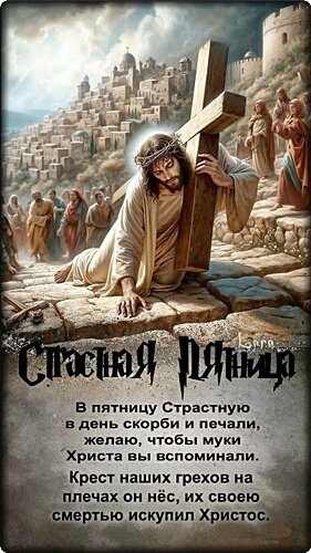 Страстная пятница. В пятницу Страстную в день скорби и печали, желаю, чтобы муки Христа вы вспоминали. Крест наших грехов на плечах он нёс, их своею смертью искупил Христос.