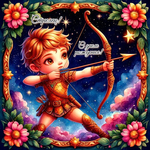 Красочная поздравительная открытка для Стрельца. На изображении представлен очаровательный маленький лучник в золотых доспехах, стреляющий из лука на фоне звездного ночного неба с облаками. Картинка обрамлена золотой рамой с цветами и надписью «С днем рождения, Стрелец!». Идеально подходит для поздравления людей, родившихся под знаком зодиака Стрелец, в социальных сетях или мессенджерах. Яркая, сказочная и волшебная иллюстрация в стиле фэнтези.