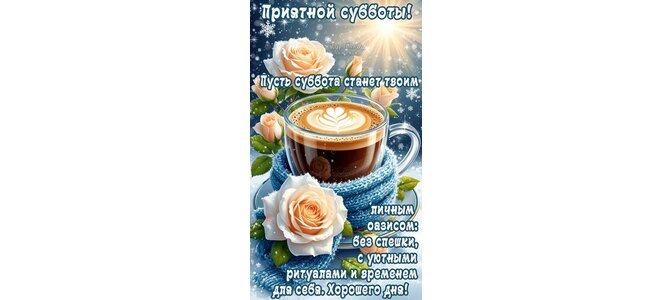 Приятной субботы! Пусть суббота станет твоим личным оазисом: без спешки, с уютными ритуалами и временем для себя. Хорошего дня!