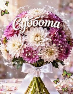 Красивая поздравительная открытка с пышным букетом белых и розовых хризантем. На изображении присутствует надпись «Суббота», выполненная изящным шрифтом с золотистым контуром. Букет украшен сверкающими искрами, волшебными бликами и нежными бабочками, летающими вокруг. Внизу букет перевязан пышным белым атласным бантом с блестящей брошью в центре. Изображение наполнено праздничной и утренней атмосферой, идеально подходит для отправки в мессенджерах и социальных сетях для пожелания доброго утра в субботу.
