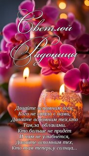 Красивая поздравительная открытка к Радонице с изображением розовых орхидей и горящих свечей. На картинке размещен трогательный текст на русском языке: «Давайте вспомним всех, кого не стало с нами...», призывающий почтить память ушедших близких. Эстетичное и светлое изображение, идеально подходящее для выражения скорби, памяти и светлой грусти в день Радоницы.