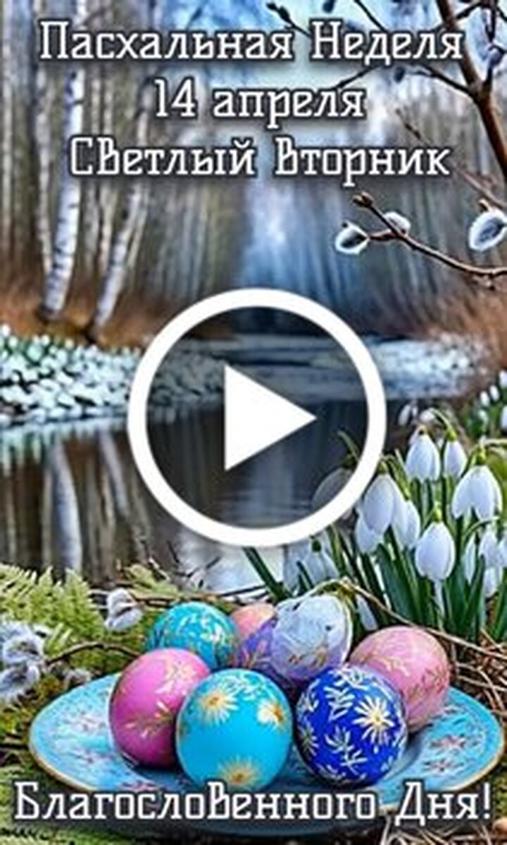 Красивое поздравительное видео к Пасхальной неделе. В видео изображен живописный весенний пейзаж с рекой и лесом на фоне. На переднем плане представлены праздничные пасхальные яйца с узорами и белые цветы тюльпаны. Сюжет дополнен летящей птицей и надписью Светлый вторник 14 апреля Благословенного дня. Видео наполнено атмосферой весны и праздника.