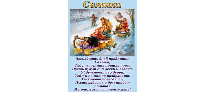 Святки. Двенадцать дней продлятся Святки, гадать, гулять пришла пора, пусть будут дни легки и гладки, уйдут печали со двора, тебя я в Святки поздравляю, ты хорошо повеселись, пусть радость в дом придет большая И ярче, лучше станет жизнь!