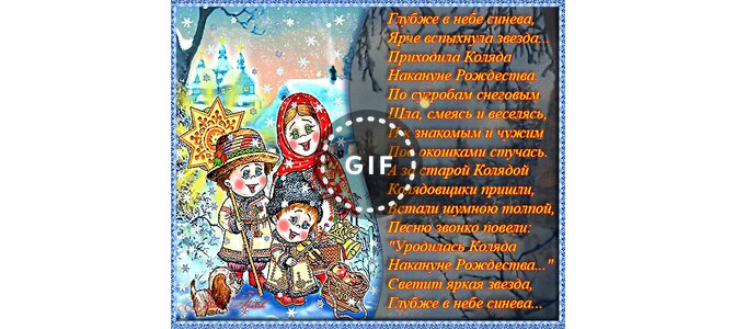 Глубже в небе синева, ярче вспыхнула звезда... Приходила Коляда накануне Рождества. По сугробам снеговым шла, смеясь и веселясь, и к знакомым и чужим под окошками стучась. А за старой Колядой колядовщики пришли, встали шумною толпой, песню звонко повели: " Уродилась Коляда Накануне Рождества... Светит яркая звезда, Глубже в небе синева...