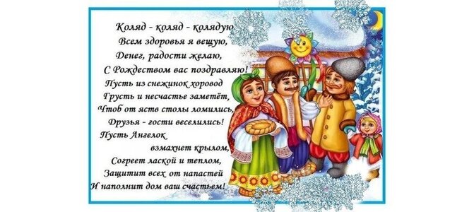 Коляд - коляд - колядую всем здоровья я вещую, денег, радости желаю, с Рождеством вас поздравляю! Пусть из снежинок хоровод грусть и несчастье заметёт, чтоб от яств столы ломились, друзья - гости веселились! Пусть Ангелок взмахнет крылом, согреет лаской и теплом, защитит всех от напастей и наполнит дом ваш счастьем!